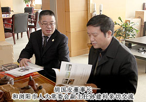 2013年1月25日上午,瀏陽市人大常委會副主任孫建科、瀏陽市人大常委會秘書長唐林軍一行蒞臨綠之韻集團(tuán)考察指導(dǎo)工作,胡國安董事長全程陪同考察組參觀了綠之韻集團(tuán)總部。