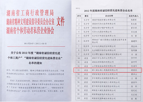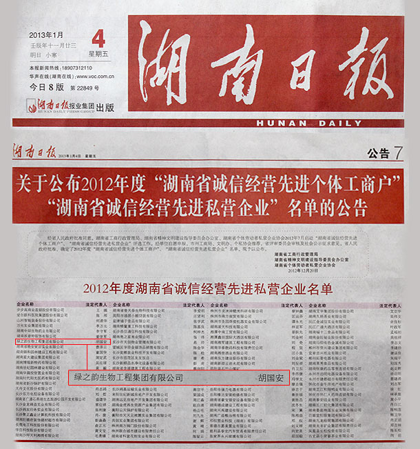 2013年1月4日上午,湖南省工商行政管理局、湖南省精神文明建設(shè)指導(dǎo)委員會辦公室、湖南省個體勞動者私營企業(yè)協(xié)會聯(lián)合召開新聞通報會,公布“2012年度湖南省誠信經(jīng)營先進個體工商戶”和“2012年度湖南省誠信經(jīng)營先進私營企業(yè)”名單。湖南省工商局黨組書記、局長李金冬出席會議并通報評選活動開展情況;省文明辦副主任周孟霞宣讀誠信經(jīng)營先進個體工商戶名單;省工商局總會計師、省個私協(xié)會常務(wù)副會長、評審委員會主任張其術(shù)宣讀誠信經(jīng)營先進私營企業(yè)名單。會議由省工商局黨組副書記、副局長寇勇主持。綠之韻集團董事、常務(wù)副總裁勞嘉等先進誠信經(jīng)營單位代表以及省工商局有關(guān)部門負(fù)責(zé)人參加通報會。