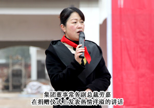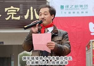 洞陽鎮(zhèn)矮橋小學(xué)蘇敏莊校長在捐贈(zèng)儀式上致感謝辭,他首先代表學(xué)校全體師生,對(duì)綠之韻集團(tuán)捐贈(zèng)課桌椅和御寒衣服的仁義大愛表示衷心的感謝。他說,我是今年下半年才來到矮橋小學(xué)的,在接到任命之前,沒來過這所學(xué)校,當(dāng)來到這里后,我被這個(gè)學(xué)校的陳舊所震撼。看到這些,我都想退出,可退出只能當(dāng)想法,唯一的辦法就是全身心的投入工作,把學(xué)校建設(shè)好,并呼吁匯集社會(huì)力量捐資助學(xué),興資辦學(xué)。綠之韻集團(tuán)董事長胡國安先生、董事常務(wù)副總裁勞嘉女士,他們是具有遠(yuǎn)見卓識(shí)而又充滿博愛心腸的慈善企業(yè)家。綠之韻集團(tuán),由小而大,聲譽(yù)日隆,這固然和他們先進(jìn)的經(jīng)商理念相關(guān),但我覺得這更和他們心宅仁厚,廣結(jié)善緣密不可分。綠之韻集團(tuán)對(duì)我校捐贈(zèng)桌椅、衣物、學(xué)習(xí)用品等物資,施以援手,奉獻(xiàn)愛心,直接受益的是我的學(xué)生們,直接受益的是洞陽鎮(zhèn)教育事業(yè)。作為一校之長的我,更要勤奮工作,不辜負(fù)綠之韻集團(tuán)和社會(huì)各界對(duì)矮橋小學(xué)的厚望,創(chuàng)造出更加輝煌的業(yè)績。