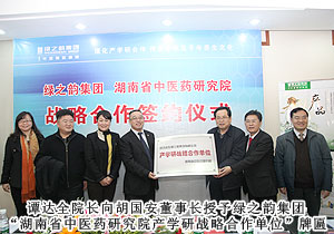 為更好地實(shí)現(xiàn)綠之韻第二個(gè)十年發(fā)展“大健康”產(chǎn)業(yè)規(guī)劃,2012年12月7日,綠之韻集團(tuán)與湖南省中醫(yī)藥研究院、湖南中醫(yī)藥大學(xué)正式簽署戰(zhàn)略合作,決定在中醫(yī)藥健康產(chǎn)品研究開發(fā)、新品實(shí)驗(yàn)、產(chǎn)品安全、綠之韻產(chǎn)品研發(fā)中心科研力量提升、專業(yè)人才引進(jìn)等多個(gè)領(lǐng)域進(jìn)行全面的戰(zhàn)略合作,持續(xù)加速產(chǎn)、學(xué)、研一體化格局。湖南省中醫(yī)藥大學(xué)黨委副書記、紀(jì)委書記、研究院黨委副書記秦裕輝,湖南省中醫(yī)藥研究院院長(zhǎng)、黨委副書記、湖南中醫(yī)藥大學(xué)副校長(zhǎng)譚達(dá)全,湖南省中藥研究所所長(zhǎng)張水寒出席簽約儀式。在湖南中醫(yī)藥研究院領(lǐng)導(dǎo)、專家及湖南綠之韻保健日用品有限公司總工程師·產(chǎn)品研發(fā)專家譚雪軍等共同見證下,綠之韻集團(tuán)董事長(zhǎng)胡國(guó)安與湖南省中醫(yī)藥研究院院長(zhǎng)、中醫(yī)藥大學(xué)副校長(zhǎng)譚達(dá)全簽署戰(zhàn)略協(xié)議,并接受“湖南省中醫(yī)藥研究院產(chǎn)學(xué)研戰(zhàn)略合作單位”授牌,董事、常務(wù)副總裁勞嘉作“綠之韻未來十年健康產(chǎn)業(yè)方向與產(chǎn)業(yè)機(jī)會(huì)”報(bào)告,承諾將以專業(yè)、負(fù)責(zé)任的態(tài)度,打造“綠色湖南”健康品牌。