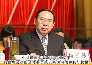 開(kāi)幕式前,中共湖南省委書記、省人大常委會(huì)主任周強(qiáng),湖南省人民政府省長(zhǎng)徐守盛,中共湖南省委副書記梅克保,中共湖南省委常委、省軍區(qū)政委李有新,中共湖南省委常委、省委秘書長(zhǎng)易煉紅,湖南省人大常委會(huì)副主任陳叔紅,省政府副省長(zhǎng)韓永文,省政協(xié)副主席王曉琴等領(lǐng)導(dǎo)親切接見(jiàn)全體青聯(lián)委員并合影留念。省委副書記梅克保出席開(kāi)幕式并做重要講話。梅克保指出,實(shí)踐證明,當(dāng)代湖南青年是值得信賴、堪當(dāng)重任、大有希望的一代。今后五年,是我省全面建設(shè)小康社會(huì)、加快推進(jìn)現(xiàn)代化進(jìn)程的關(guān)鍵時(shí)期。省第十次黨代會(huì)科學(xué)描繪了湖南未來(lái)五年改革發(fā)展的宏偉藍(lán)圖,提出了“四化兩型”的總戰(zhàn)略和“兩個(gè)加快、兩個(gè)率先”的總?cè)蝿?wù)。實(shí)現(xiàn)這一目標(biāo)任務(wù)是全省人民的共同心愿,也需要全省人民團(tuán)結(jié)一心、奮力拼搏。我省青年作為其中最富朝氣最具前途的重要群體,更是義不容辭、責(zé)無(wú)旁貸。