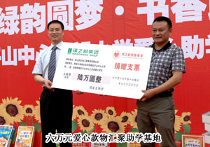 2012年6月25日,綠之韻黑龍江分公司“綠韻圓夢(mèng)?書(shū)香助學(xué)”活動(dòng)暨綠之韻平山中心小學(xué)愛(ài)心助學(xué)基地授牌儀式成功舉行。為了給渴望知識(shí)的孩子們創(chuàng)造更好的讀書(shū)環(huán)境,活動(dòng)當(dāng)天,綠之韻黑龍江地區(qū)近100名優(yōu)秀經(jīng)銷商將愛(ài)心圖書(shū)親手送到了學(xué)生手中,同時(shí),綠之韻集團(tuán)東北區(qū)域業(yè)務(wù)總監(jiān)李定代表綠之韻慈善基金向愛(ài)心助學(xué)基地捐贈(zèng)6萬(wàn)元款物,標(biāo)志著綠之韻第二家校園愛(ài)心“流動(dòng)圖書(shū)館”正式成立。