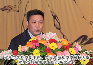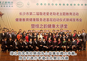 2012年4月17日,由綠之韻集團(tuán)與長沙市老齡委共同舉辦的長沙市第二屆敬老愛老助老活動(dòng)啟動(dòng)儀式在長沙市人民政府隆重舉行。原中共長沙市委副書記張慧明,原長沙市人大主任、市老齡委顧問楊宏,原長沙市人大副主任、市老齡委顧問劉湘皋,湖南省老齡委辦公室副主任李永勝、劉憲銘,長沙市老齡委常務(wù)副主任、市民政局局長曹再興,長沙市老齡委副主任、市民政局黨委委員楊為錦,長沙市老齡委副主任、辦公室主任廖肇聯(lián)等蒞臨指導(dǎo),長沙市工商行政管理局、財(cái)政局、科學(xué)技術(shù)局等50家合作政府機(jī)關(guān)、企業(yè)代表與綠之韻優(yōu)秀經(jīng)銷商張建軍、黃翔、李正元等共計(jì)1300余人參加了啟動(dòng)儀式。