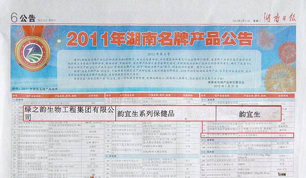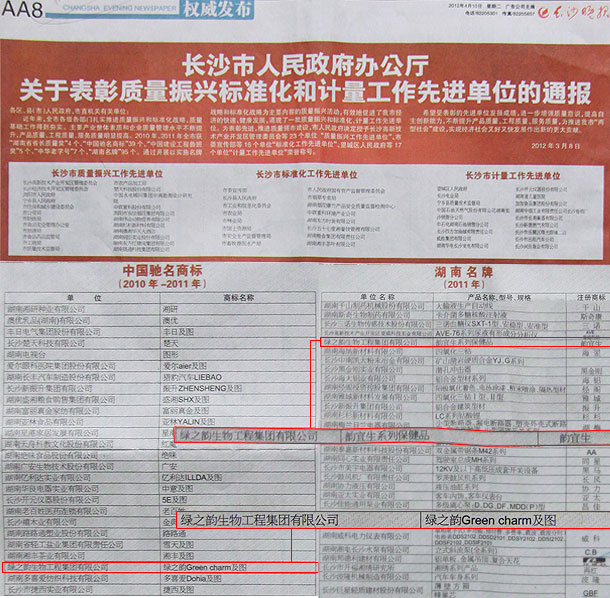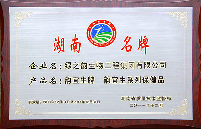 2012年4月10日,長沙市人民政府質(zhì)量工作會(huì)議成功召開。長沙市人民政府副市長何寄華,長沙市質(zhì)量監(jiān)督局局長陳曙光、副局長周笑春出席會(huì)議并發(fā)表重要講話。會(huì)上,綠之韻韻宜生系列產(chǎn)品榮獲“湖南名牌”榮譽(yù)稱號,是繼“韻宜生”商標(biāo)榮獲“湖南省著名商標(biāo)”后的又一重大榮譽(yù)。
