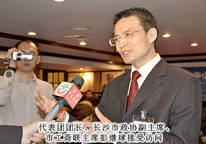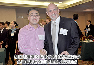 美國當(dāng)?shù)貢r(shí)間2011年9月20日上午,“長沙——美國中小企業(yè)合作周”商貿(mào)對(duì)接會(huì)在美國北卡羅來納州隆重舉行。在長沙市人民政府的組織下,來自各行各業(yè)的民營企業(yè)家在長沙市政協(xié)副主席、市工商聯(lián)主席彭繼球的帶領(lǐng)下,赴美參加為期12天的合作周考察活動(dòng)。長沙市工商聯(lián)(總商會(huì))副主席、綠之韻集團(tuán)董事長胡國安應(yīng)邀赴美考察。