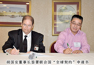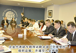 考察過程中,企業(yè)家代表團(tuán)一行專程拜訪了聯(lián)合國“全球契約”組織總部,與聯(lián)合國“全球契約”總干事喬治?科爾進(jìn)行了友好、親切的會(huì)見。綠之韻集團(tuán)、楚天科技、佳樂實(shí)業(yè)等湖南省15家民營企業(yè)現(xiàn)場向該組織遞交了入會(huì)申請(qǐng)。“全球契約”是一種思路和價(jià)值觀,由前聯(lián)合國秘書長安南首倡議,潘基文秘書長繼續(xù)推動(dòng)。該契約旨在鼓勵(lì)全球企業(yè)與聯(lián)合國機(jī)構(gòu)、勞工組織和民間團(tuán)體一起,共同尋找克服全球化負(fù)面影響的途徑。加入該組織的單位必須在遵守人權(quán)、勞動(dòng)標(biāo)準(zhǔn)、環(huán)境保護(hù)等方面率先垂范。