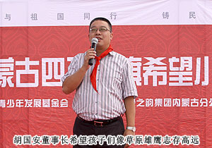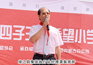 2011年7月20日,位于內(nèi)蒙古自治區(qū)烏蘭察布市的四子王旗熱鬧非凡--綠之韻四子王旗希望小學在此舉行隆重的捐贈儀式。內(nèi)蒙古自治區(qū)青少年發(fā)展基金會秘書長劉建忠、四子王旗旗委、常務(wù)副旗長蔚代青、政協(xié)副主席于有升、四子王旗工商局局長董明、副局長賈晉峰等政府領(lǐng)導及各界媒體嘉賓蒞臨,綠之韻集團董事長胡國安、執(zhí)行總經(jīng)理龔振、綠之韻慈善基金總執(zhí)行戴曉彥不遠萬里趕赴捐贈現(xiàn)場,內(nèi)蒙古分公司經(jīng)理候立新、內(nèi)蒙古地區(qū)愛心大使代表王連坤、郝建兵、張聞英以及2000余名綠之韻愛心大使參與愛心傳遞。