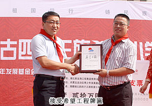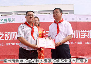 胡國安董事長向內(nèi)蒙古自治區(qū)青基會秘書長劉建忠遞交二十萬捐贈支票,并接受希望工程牌匾。劉建忠秘書長發(fā)表講話,向勇于承擔社會責任的綠之韻集團和全體營銷精英致上誠摯敬意。四子王旗常委、常務(wù)副旗長蔚代青與胡國安董事長共同為希望小學揭牌,并向胡國安董事長頒發(fā)榮譽市民證書。青基會秘書長劉建忠和執(zhí)行總經(jīng)理龔振給愛心經(jīng)銷商頒發(fā)證書,整個活動現(xiàn)場人潮洶涌,彌漫著感恩與關(guān)愛,孩子們精彩的節(jié)目表演將揭牌儀式活動推向了高潮,現(xiàn)場所有精英心懷感動,愿意盡自己的能力獻出更多關(guān)愛和溫暖。龔總在致辭中說:在綠之韻八年的發(fā)展中,綠之韻慈善基金在教育、幫扶、救災、助學等方面作出的公益事業(yè)投入累計已近2000萬元,是每一位愛心綠之韻精英的點滴匯聚才有了公司萬涓成海的善舉。