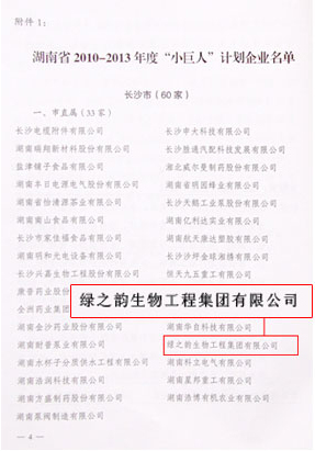 依據(jù)《中華人民共和國中小企業(yè)促進(jìn)法》,并進(jìn)一步貫徹落實(shí)湖南省委、省政府確定的工業(yè)強(qiáng)省戰(zhàn)略,推進(jìn)“四千工程”和“兩型”社會建設(shè)的要求,近日,湖南省經(jīng)濟(jì)和信息化委員會隆重公布了湖南省“小巨人”計(jì)劃和“創(chuàng)業(yè)”計(jì)劃企業(yè)名單,在長沙市直屬33家“小巨人”計(jì)劃企業(yè)中,綠之韻集團(tuán)榜上有名。