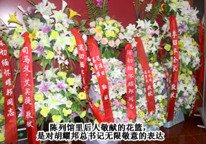 在偉大的無產(chǎn)階級(jí)革命家、政治家,原中國共產(chǎn)黨中央委員會(huì)總書記胡耀邦故居陳列館里,擺放著大大小小的花籃,那是后人對(duì)胡耀邦總書記一生“一身正氣,兩袖清風(fēng)”無限敬意的表達(dá)。中共中央政治局委員、十一屆全國人大常委會(huì)副委員長、中華全國總工會(huì)主席王兆國,原中華人民共和國中央軍事委員會(huì)副主席,國務(wù)委員兼國防部部長遲浩田、中共湖南省委書記、省人大常委會(huì)主任周強(qiáng)等領(lǐng)導(dǎo)先后敬獻(xiàn)花籃。胡國安董事長也滿懷對(duì)偉大革命家的尊敬之情敬獻(xiàn)花籃,深切緬懷胡耀邦總書記。