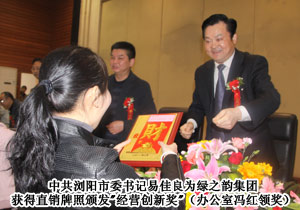 2011年3月10日,長沙國家生物產(chǎn)業(yè)基地經(jīng)濟工作會議在瀏陽市行政中心隆重召開。中共長沙市委常委、瀏陽市委書記易佳良、長沙市人民政府副市長何寄華、湖南省科技廳副廳長羅亞軍等省市級政府領導出席會議并發(fā)表重要講話。綠之韻集團榮獲“2010年度稅收過千萬企業(yè)”“經(jīng)營創(chuàng)新獎”“目標管理一等獎”“統(tǒng)計工作先進單位” 多項殊榮;綠之韻迪博制藥有限公司在2010年獲評“湖南省著名商標”獲得“名牌產(chǎn)品獎”。綠之韻員工陳英、易利群榮獲“2010年度統(tǒng)計工作先進個人”。綠之韻集團董事長胡國安出席領獎并接受產(chǎn)業(yè)基地下達的2011年目標管理任務書。