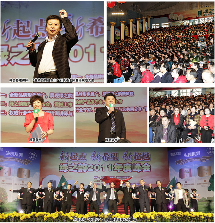 2011年3月6日,綠之韻迎來了成長第八個(gè)年頭的高峰會(huì)議,也是正式以直銷企業(yè)亮劍的開年大戲。在全新的起點(diǎn)上如何規(guī)劃新的格局,繼續(xù)譜寫新的成績,所有綠之韻伙伴最為期待的答案正式揭曉!本次會(huì)議以“新起點(diǎn) 新希望 新超越”為主題,從行業(yè)整體走向、市場(chǎng)發(fā)展規(guī)劃、產(chǎn)品形象創(chuàng)新、業(yè)務(wù)技能提升四大版塊集中展示綠之韻人獨(dú)有的豪情和信心。綠之韻集團(tuán)高管、政府領(lǐng)導(dǎo)、權(quán)威媒體、綠之韻各事業(yè)部代表、全國各地市場(chǎng)經(jīng)銷商領(lǐng)袖以及三千余名綠之韻事業(yè)伙伴齊聚一堂。
