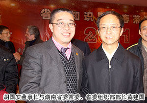 2011年1月5日,由湖南省委組織部、省委人才工作領(lǐng)導(dǎo)小組主辦、團省委承辦的2011年度湖南省會知識界迎春茶話會在蓉園賓館舉行。湖南省委常委、省委組織部部長、省委人才工作領(lǐng)導(dǎo)小組組長黃建國、湖南省人大常委副主任肖雅瑜等省領(lǐng)導(dǎo)和省會各界在湘知識界的院士、專家學(xué)者代表歡聚一堂、暢敘友情、互致問候、喜迎新春。茶話會由湖南省人民政府副省長郭開朗主持,綠之韻集團董事長胡國安作為榮獲湖南省人民政府一等功的湖南省優(yōu)秀青年企業(yè)家代表、省企業(yè)文化促進協(xié)會副會長應(yīng)邀出席,共話發(fā)展。