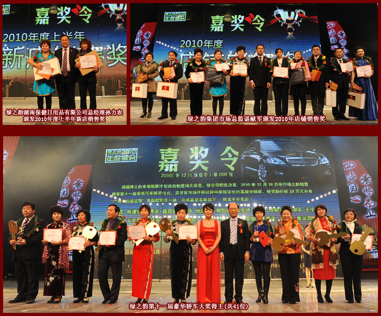 在星光閃耀、榮光無(wú)限的年會(huì)頒獎(jiǎng)舞臺(tái),曾經(jīng)含淚播種的英雄,此刻含笑收獲。2010年度星級(jí)鉆石榮譽(yù)徽章大獎(jiǎng)、2010年度豪華轎車(chē)大獎(jiǎng)、2010年店鋪銷(xiāo)售獎(jiǎng)、2010年度上半年新店銷(xiāo)售獎(jiǎng),每一項(xiàng)榮譽(yù)都是曾經(jīng)努力奮斗的佐證。他們,在開(kāi)拓中崛起,在堅(jiān)持中壯大,奔跑的腳步從未停歇,在他們的感言分享中,我們可以見(jiàn)證綠之韻人逐夢(mèng)的力量,感受夢(mèng)想實(shí)現(xiàn)的喜悅與感動(dòng)。