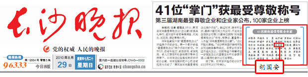 2010年8月28日,由湖南省科技廳、湖南省國(guó)家稅務(wù)局、湖南企業(yè)發(fā)展調(diào)研辦公室、湖南發(fā)展研究中心等單位聯(lián)合舉辦的"第三屆湖南最受尊敬企業(yè)推介"頒獎(jiǎng)盛典暨新聞通報(bào)會(huì)在湖南蓉園賓館舉行。湖南省人大常委會(huì)黨組成員、省政府顧問唐之享、原湖南省委書記熊清泉、原湖南省政協(xié)主席劉夫生等老領(lǐng)導(dǎo)出席本次頒獎(jiǎng)活動(dòng)?!逗先?qǐng)?bào)》、《瀟湘晨報(bào)》、紅網(wǎng)、長(zhǎng)沙新聞?lì)l道等多家媒體對(duì)本次評(píng)選給予高度關(guān)注。綠之韻集團(tuán)榮獲“湖南最受尊敬企業(yè)”榮譽(yù)稱號(hào),胡國(guó)安董事長(zhǎng)被授予“湖南最受尊敬企業(yè)家”榮譽(yù)稱號(hào)。