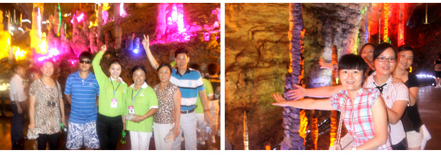 游覽享有“世界溶洞全能冠軍”之稱的黃龍洞景區(qū),伙伴們再一次被大自然深深震撼:洞中燈火闌珊、石筍林立,猶如一株株古木錯節(jié)盤根、洞中有洞、洞中有河、無奇不有,真乃名副其實的“地下魔宮”! 洞內(nèi)有迷宮、響水河、天仙水、天柱街、龍宮等六大景區(qū),長廊蜿蜒,鐘乳懸浮,石柱石筍林立,還有石簾、石幔、石花、石琴,琳瑯滿目,異彩紛呈。更讓人感到新鮮別致的是那色澤,紅、藍、青、綠、黃、白、紫,重重疊疊,絢麗多彩,滿目珠璣,令人眼花潦亂。山的腹地,濃縮著如此美麗的景致,被精雕細刻的如此晶瑩、閃亮,伙伴們被這種神奇的力量所感染,靜靜地欣賞著,不錯過任何一處的精彩。