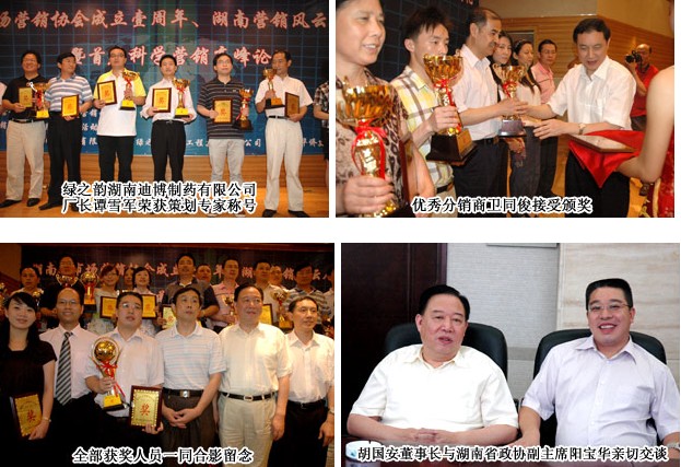 2009年6月23日上午,胡國安董事長應(yīng)邀出席在湖南省委蓉園賓館隆重舉行的“湖南省市場營銷協(xié)會(huì)成立周年慶典暨湖南營銷風(fēng)云人物頒獎(jiǎng)典禮”活動(dòng),并榮獲“2008—2009年度湖南省十大營銷風(fēng)云人物”稱號(hào),此外,綠之韻集團(tuán)執(zhí)行總經(jīng)理龔振榮獲“湖南十大營銷團(tuán)隊(duì)建設(shè)專家”稱號(hào)、董事長助理馬艷榮獲“湖南十大營銷管理專家”稱號(hào),綠之韻湖南迪博制藥有限公司廠長譚雪軍榮獲“湖南十大營銷策劃專家”稱號(hào)、優(yōu)秀分銷商衛(wèi)同俊榮獲“湖南十大營銷團(tuán)隊(duì)建設(shè)專家”稱號(hào),再一次向社會(huì)各界展示了綠之韻集團(tuán)雄厚的管理實(shí)力。