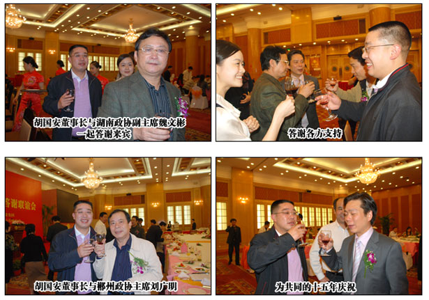 2008年4月21日,由政協(xié)湖南省委主辦的湖南黨政權(quán)威機關(guān)報《湘聲報》更名擴版十五周年答謝聯(lián)誼會在湖南長沙華天大酒店隆重舉行。湖南政協(xié)副主席陽寶華、湖南政協(xié)副主席、湖南廣播影視集團董事長魏文彬以及各地市政協(xié)領(lǐng)導(dǎo)、社會各界代表紛紛到場表示祝賀。綠之韻集團董事長兼總裁胡國安先生作為《湘聲報》的特別顧問、名譽主編也應(yīng)邀出席了此次聯(lián)誼會,并發(fā)表重要講話。