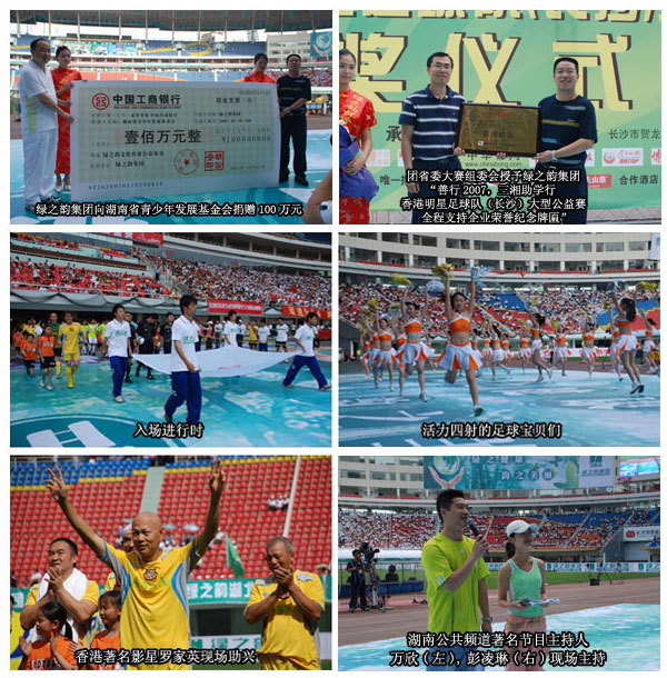 2007年5月20日下午3點(diǎn),星城長沙因?yàn)檫h(yuǎn)道而來的香港明星足球隊(duì)和來自全國各地的綠之韻精英顯得更加光輝燦爛。為歡慶四周年慶典,綠之韻集團(tuán)公司與香港明星足球隊(duì)攜手的“綠之韻杯善行2007三湘助學(xué)行”香港明星足球隊(duì)(長沙)大型公益賽”在賀龍?bào)w育中心隆重進(jìn)行。這是一場由共青團(tuán)湖南省委、湖南省體育局指導(dǎo),湖南省青少年發(fā)展基金會主辦、綠之韻集團(tuán)全程支持的以助學(xué)為宗旨,以推動我省農(nóng)村青年文化扶貧計(jì)劃為主旋律的大型公益活動。湖南省人大常委會副主任王四連女士、共青團(tuán)湖南省委副書記張值恒先生為本次賽事致辭,共青團(tuán)湖南省委副書記陳雪楚、湖南省文化廳廳長金則恭、湖南省體育局副局長熊倪、湖南省青少年發(fā)展基金會理事長李克勛、中共長沙市委常委、市政府常務(wù)副市長向力力、長沙市人大副主任張菊平 、長沙市政府副市長曹亞等政府領(lǐng)導(dǎo)也親臨球賽現(xiàn)場。慈善與體育的水乳交融,明星與精英的交相輝映,讓整個賽場呈現(xiàn)出令人振奮的萬千姿彩。綠茵場上,這場在善行的大旗下,以愛心的名義舉行的公益足球賽,由湖南省青少年發(fā)展基金會理事長李克勛先生和綠之韻集團(tuán)董事長胡國安先生共同為比賽開球。香港明星足球隊(duì)與綠之韻善行聯(lián)隊(duì)的對抗精彩紛呈。譚詠麟、陳百強(qiáng)、黃日華、羅家英等明星在球場上同樣風(fēng)采照人?;盍λ纳涞淖闱?qū)氊愋?、賽事中場香港著名歌星左筠、影星羅家英和炙手可熱的超女唐笑等相繼一展美妙歌喉的精彩表演讓現(xiàn)場觀眾熱情高漲