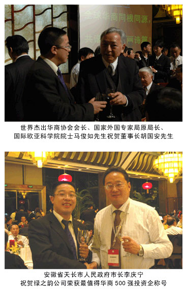 本屆評選得到了國家領導人的高度重視,世界華商協(xié)會主席第九屆全國政協(xié)副主席孫孚凌擔任大會主席、全國人大常委會副委員長何魯麗擔任第二屆世界杰出華商大會主席,全國人大常委員會副委員長顧秀蓮、全國政協(xié)副主席阿不來提﹒阿不都熱西提等國家領導人出席了大會開幕式;當天世界杰出華商協(xié)會主席第九屆全國政協(xié)副主席孫孚林、世界杰出華商協(xié)會會長、國家外國專家局原局長、國際歐亞科學院院士馬俊如等國家相關領導人在北京釣魚臺國賓館與優(yōu)秀的企業(yè)領導人以最高級別的慶祝晚宴為本屆獲獎企業(yè)表示祝賀。國家領導人親切的接見了香港綠之韻國際集團董事長胡國安先生。對綠之韻公司傳承五千年養(yǎng)生文化的經(jīng)營理念和構(gòu)筑百年民族品牌的發(fā)展目標給于了高度的贊賞和肯定。