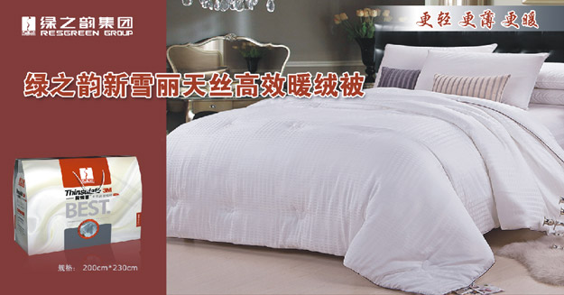 綠之韻集團(tuán)與世界500強(qiáng)企業(yè)3M公司強(qiáng)強(qiáng)聯(lián)手推出高科技被芯——綠之韻新雪麗天絲高效暖絨被。此款被芯使用的是市場(chǎng)上熱重效率最高的合成保溫材料,利用被芯形成具有高吸附空氣性能的空間結(jié)構(gòu),從而阻止人體熱量通過(guò)空氣對(duì)流散失,同時(shí)反射回大部分的人體熱輻射,這樣就保障了人體熱量盡可能少的損失。且3M公司的新雪麗保溫材料就是為了可以承受地球上最苛刻的環(huán)境條件才研制出來(lái)的,因此從它誕生起就比一般的保溫材料更保暖。實(shí)驗(yàn)證明,在相同重量的情況下,要多550克羽絨作為填充料,才能達(dá)到這樣一款新雪麗暖絨被的保暖效果,這也直接解決冬天蓋被臃腫的難題。