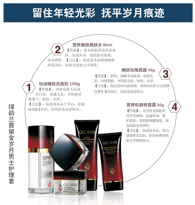 TIPS:留金歲月男士護理套裝適合干性、中性的男性皮膚使用。能深層清除污垢、補充養(yǎng)分,迅速補水,軟化、溶解老化壞死細胞,凈化肌膚;補充養(yǎng)分和水分,修護肌膚,恢復(fù)彈性。