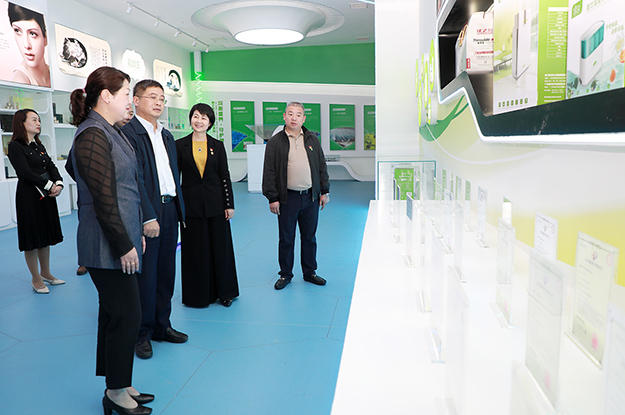 在綠之韻國際會議中心展廳,勞嘉總裁圍繞企業(yè)文化、產品研發(fā)、市場布局和公益慈善等方面的工作情況向調研組一行作了簡要匯報。展廳內大量的圖片、文字和視頻介紹,以及多媒體聲光電同步演示技術展出的數(shù)百件產品實物向調研組一行生動展示了綠之韻深耕大健康行業(yè)十七年所積淀的科研技術優(yōu)勢、產學研綜合實力以及產業(yè)鏈全貌。多年來,綠之韻始終堅持“以產品為導向”的研發(fā)理念,不僅成立了以院士、專家教授為核心的產品專家委員會,同時加大科研投入,不斷深化與知名高等院校、科研機構的“產學研”合作,抓緊籌建綠之韻博士后科研工作站。目前,公司主營產品涵蓋健康食品、護膚品、日用品以及健康生活等百余品種,在長沙、益陽、南京、廣州等地建立了5大種植基地、3大生產基地,擁有“韻宜生”“綠韻蘭茜”“享居”“億她”四大子品牌,銷售網絡覆蓋全國大部分省市。在振興實業(yè)的同時,綠之韻積極承擔企業(yè)公民責任,踴躍參與和傾情捐助了萬企幫萬村、同心工程、綠+兒童、關愛貧困母親、賑災扶貧等100多項社會公益事業(yè),累計捐贈款物7000多萬元。此次疫情期間,綠之韻公益基金會第一時間發(fā)出愛心募捐倡議,公司黨委、工會、全國分公司、各下屬機構上下聯(lián)動,通過多種方式積極援助湖北湖南抗擊疫情,累計捐贈款物200多萬元。