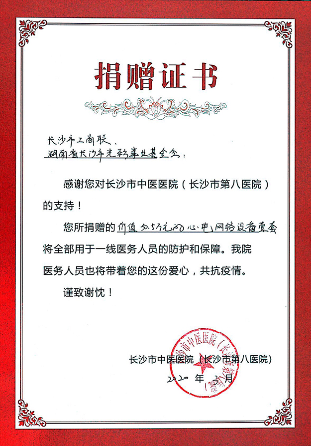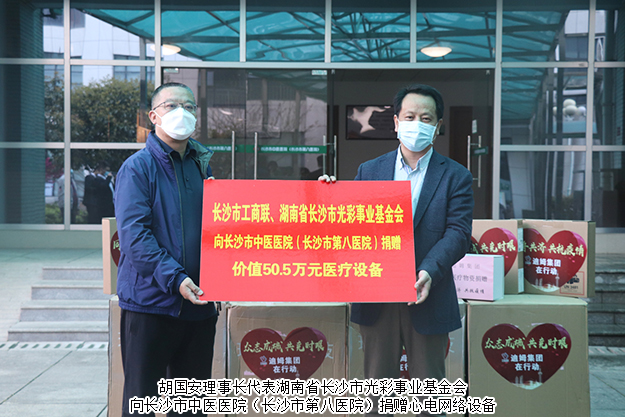 湖南省長沙市光彩事業(yè)基金會理事長、綠之韻集團董事長胡國安代表湖南省長沙市光彩事業(yè)基金會向長沙市中醫(yī)醫(yī)院(長沙市第八醫(yī)院)捐贈價值50.5萬元心電網(wǎng)絡(luò)設(shè)備。長沙市中醫(yī)醫(yī)院(長沙市第八醫(yī)院)黨委副書記、院長周繼如代表醫(yī)院接受捐贈物資,他表示:自疫情發(fā)生以來,醫(yī)院全體干部職工積極投身抗擊疫情第一線,全力以赴、盡職履責、嚴防死守,和時間賽跑,與病毒作戰(zhàn),充分展現(xiàn)了醫(yī)務(wù)工作者強烈的使命擔當。社會各界愛心人士源源不斷的捐贈,通過各種方式支援防控工作,讓廣大醫(yī)務(wù)工作者深受鼓舞、倍感溫暖,這些愛心和善舉將匯聚成打贏新冠肺炎疫情阻擊戰(zhàn)的磅礴力量。