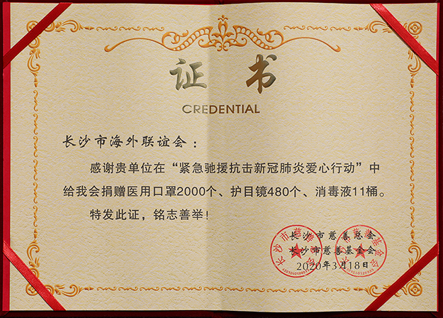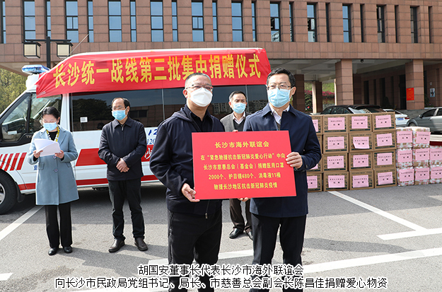 2020年3月18日,長(zhǎng)沙市統(tǒng)一戰(zhàn)線第三批集中捐贈(zèng)儀式在長(zhǎng)沙市慈善基金會(huì)前坪舉行。中共長(zhǎng)沙市委常委、市委統(tǒng)戰(zhàn)部部長(zhǎng)譚小平,長(zhǎng)沙市民政局黨組書(shū)記、局長(zhǎng)、市慈善總會(huì)副會(huì)長(zhǎng)陳昌佳,中共長(zhǎng)沙市委統(tǒng)戰(zhàn)部常務(wù)副部長(zhǎng)劉映群,中共長(zhǎng)沙市委統(tǒng)戰(zhàn)部副部長(zhǎng)、長(zhǎng)沙市僑聯(lián)黨組書(shū)記王國(guó)平等領(lǐng)導(dǎo)出席活動(dòng),市委統(tǒng)戰(zhàn)部、市民政局、市民宗局、市慈善總會(huì)有關(guān)負(fù)責(zé)同志,各民主黨派市委負(fù)責(zé)同志,市黨外知識(shí)分子聯(lián)誼會(huì)負(fù)責(zé)同志,市宗教界代表人士,市海外聯(lián)誼會(huì)、香港長(zhǎng)沙聯(lián)誼會(huì)代表人士參加活動(dòng)。湖南省政協(xié)委員、長(zhǎng)沙市海外聯(lián)誼會(huì)副會(huì)長(zhǎng)、綠之韻集團(tuán)董事長(zhǎng)胡國(guó)安受邀參加活動(dòng)。