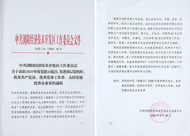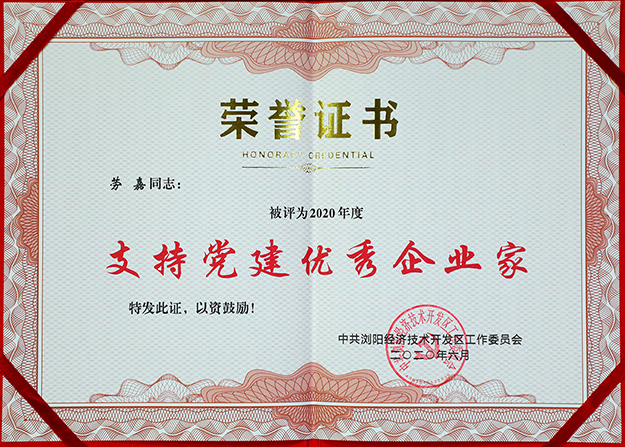 隨后,瀏陽經(jīng)開區(qū)(高新區(qū))黨工委副書記、管委會副主任尋院豪宣讀七一表彰文件。與會領(lǐng)導(dǎo)為獲得表彰的企業(yè)和個(gè)人頒獎(jiǎng)。綠之韻集團(tuán)憑借出色的黨建工作被中共長沙市委組織部評為“黨建示范點(diǎn)”“抗擊新冠肺炎疫情先進(jìn)基層黨組織”;綠之韻集團(tuán)董事、總裁勞嘉被瀏陽經(jīng)開區(qū)(高新區(qū))授予“支持黨建優(yōu)秀企業(yè)家”榮譽(yù)稱號;綠之韻集團(tuán)黨委副書記許達(dá)仲被評為“優(yōu)秀黨務(wù)工作者”;黨員趙光意、宋沂芳被評為“優(yōu)秀共產(chǎn)黨員”。