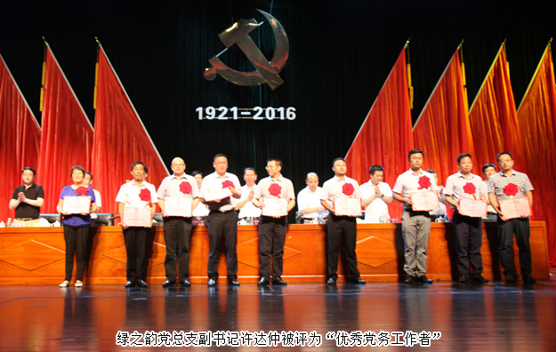 2016年7月1日,瀏陽(yáng)經(jīng)開(kāi)區(qū)慶祝建黨95周年表彰大會(huì)暨合唱比賽在園區(qū)金陽(yáng)文化藝術(shù)中心隆重召開(kāi)。全體黨委領(lǐng)導(dǎo)、機(jī)關(guān)各支部、各非公經(jīng)濟(jì)黨組織以及園區(qū)各企業(yè)代表團(tuán)等參加會(huì)議。會(huì)上,綠之韻集團(tuán)黨總支部憑借出色的黨建工作再次被評(píng)為“先進(jìn)基層黨組織”, 綠之韻黨總支副書記許達(dá)仲被評(píng)為“優(yōu)秀黨務(wù)工作者”,公司員工黃姣、楊丹被評(píng)為園區(qū)“優(yōu)秀共產(chǎn)黨員”。