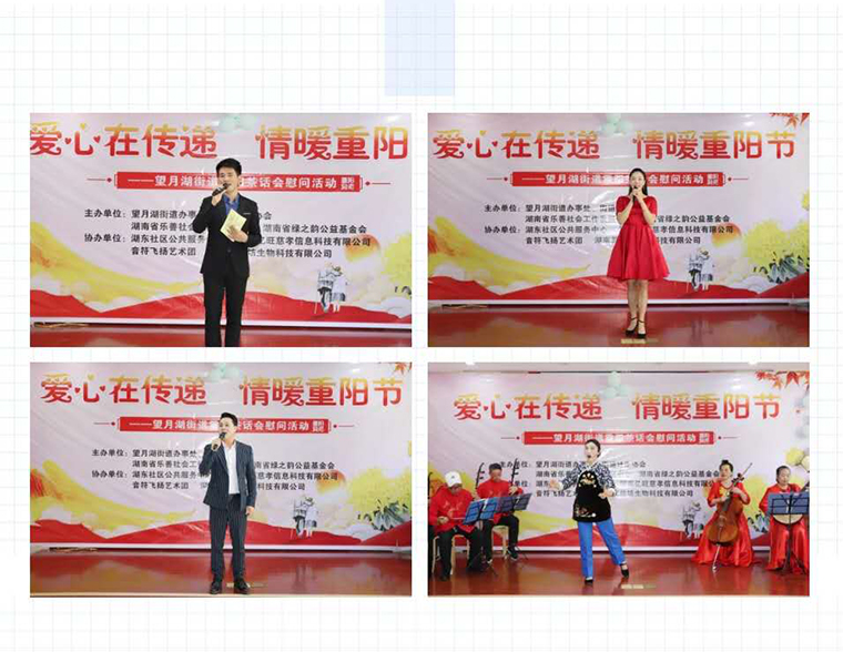 經(jīng)過前期的悉心籌劃,本次重陽節(jié)茶話會為受邀居民呈現(xiàn)了一場溫馨歡樂的舞臺盛宴:熱烈開場的《夢回乾坤灣》歌曲獨(dú)唱、輕松熱鬧的花鼓戲《劉大娘笑呵呵》、情景劇表演《百善孝為先》、風(fēng)情舞蹈《草原上升起不落的太陽》……除了慰問演出,老人們自己精心準(zhǔn)備了才藝節(jié)目,悠揚(yáng)的旋律,動人的演繹,地方味兒十足的特色演出增加了節(jié)日的幸福感。勞嘉理事長、劉云書記以及綠之韻愛心志愿者與老人們團(tuán)聚在一起觀看表演、拉家常,現(xiàn)場歌聲、掌聲、歡笑聲不斷。
