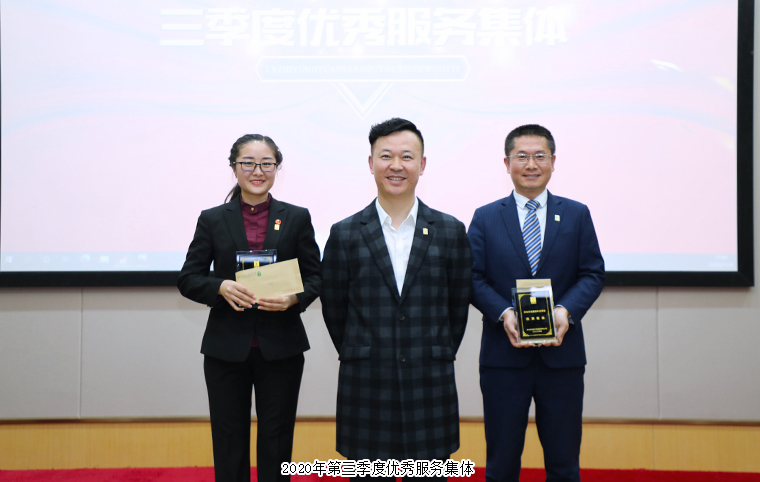 為表彰先進(jìn)、凝聚力量,進(jìn)一步激勵(lì)全體員工的積極性和奮斗激情,大會(huì)集中頒發(fā)了“三季度優(yōu)秀服務(wù)集體”“三季度服務(wù)明星”“五年服務(wù)英才獎(jiǎng)”“十年服務(wù)忠誠(chéng)獎(jiǎng)”等獎(jiǎng)項(xiàng)。傭金結(jié)算中心、新聞信息中心榮獲“2020年第三季度優(yōu)秀服務(wù)集體”稱號(hào),喻鳴鸞、靳威、楊邢軒、李向宇、王雪、牛小紅、戴明玉、林智文、李思、夏丹、劉偉、李克戰(zhàn)、戴明勇、蘇銅、肖巧林被評(píng)為“2020年第三季度星級(jí)優(yōu)秀員工”,綠之韻集團(tuán)副總裁劉淑娟、總經(jīng)理劉維利為獲獎(jiǎng)部門代表及個(gè)人頒獎(jiǎng)。肖波、曾夢(mèng)繁、朱麗妍、張婭、蘇妍、陳苗、張煜軒、劉博、吳冬梅、李星麗、牛小紅、孟慶玲、袁新星、張琳、鄧金林、劉伏海榮膺“五年服務(wù)英才獎(jiǎng)”,張曉芳、周金霖、盛夏、高素丹、彭姣、高芳榮膺“十年服務(wù)忠誠(chéng)獎(jiǎng)”,綠之韻集團(tuán)董事總裁勞嘉、副總裁胡均安先后上臺(tái)為獲獎(jiǎng)員工頒發(fā)獎(jiǎng)?wù)屡c榮譽(yù)證書,并致以熱烈祝賀?!拔迥攴?wù)英才獎(jiǎng)”代表肖波和“十年服務(wù)忠誠(chéng)獎(jiǎng)”代表周金霖分別發(fā)表獲獎(jiǎng)感言。