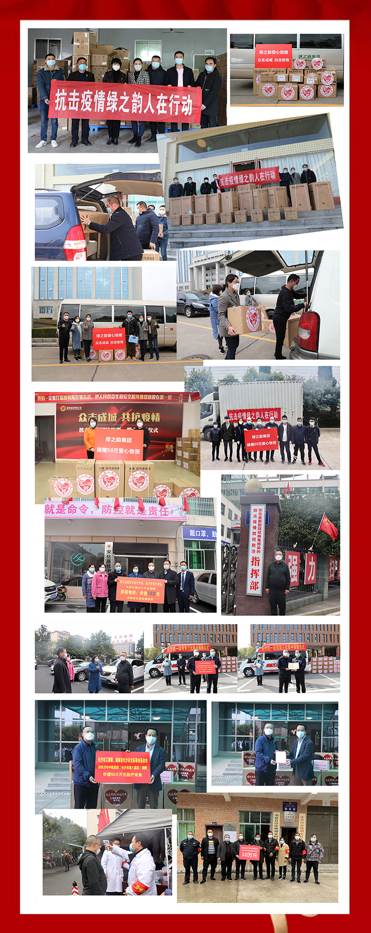 2020年的春節(jié)和往常不一樣。本該是親人團(tuán)聚的日子,卻因?yàn)橐粓?chǎng)新型冠狀肺炎疫情打亂了節(jié)奏?!耙环接须y,八方支援”,是中華民族的優(yōu)良傳統(tǒng);“關(guān)愛(ài)生命、回饋社會(huì)”,是綠之韻人的神圣使命。自疫情發(fā)生以來(lái),綠之韻集團(tuán)高度關(guān)注疫情發(fā)展,積極響應(yīng)黨和政府的號(hào)召,快速反應(yīng)、縝密部署、積極作為,集團(tuán)公司黨委、公益基金會(huì)、工會(huì)、全國(guó)分公司、各下屬機(jī)構(gòu)上下聯(lián)動(dòng),積極馳援湖北湖南等疫情較為嚴(yán)重的地方,累積捐贈(zèng)近200萬(wàn)元愛(ài)心款物和防疫急需物資,并積極開(kāi)展企業(yè)復(fù)工復(fù)產(chǎn)工作,為奪取疫情防控和經(jīng)濟(jì)社會(huì)發(fā)展雙勝利不斷貢獻(xiàn)智慧和力量。