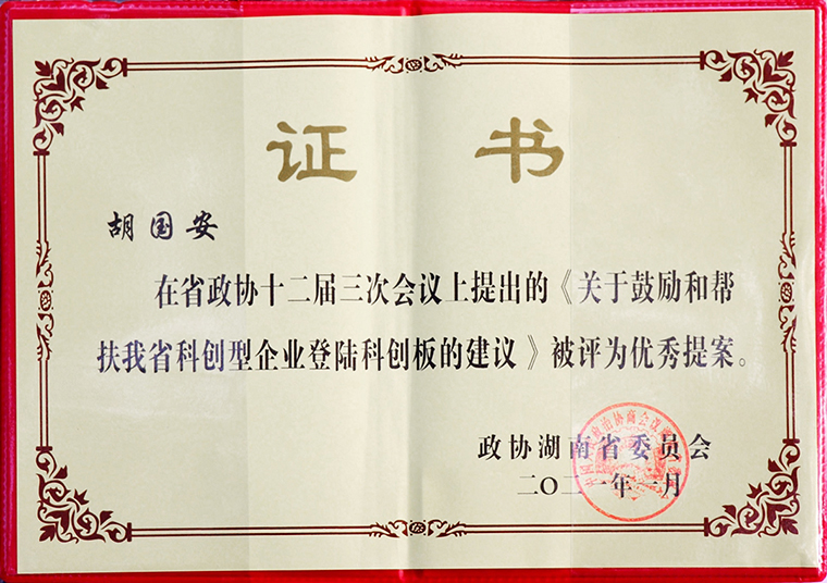 胡國安委員2020年提交的政協(xié)提案《關(guān)于鼓勵和幫扶我省科創(chuàng)型企業(yè)登陸科創(chuàng)板的建議》被政協(xié)湖南省委員會評為“優(yōu)秀提案”。作為一名三屆省政協(xié)“老委員”,胡國安委員廣泛傾聽社情民意、積極參與各種形式的調(diào)研活動,為省市實體經(jīng)濟發(fā)展獻計獻策。自履職以來,他積極參政議政,共計提交了近40份有價值的政協(xié)提案,其中所提交的《關(guān)于加快我省電業(yè)園建設(shè)的建議》《關(guān)于推進“互聯(lián)網(wǎng)+精準扶貧”的建議》等提案,引起媒體廣泛關(guān)注。2010年,被省政協(xié)授予“優(yōu)秀政協(xié)委員”光榮稱號,2016年《關(guān)于推進“互聯(lián)網(wǎng)+精準扶貧”的建議》提案榮獲省政協(xié)“優(yōu)秀提案”表彰。2018年,代表致公黨湖南省委提交的《關(guān)于主動對接融入粵港澳大灣區(qū),加快推進長沙空鐵經(jīng)濟示范區(qū)的建議》提案,獲中共湖南省委書記許達哲重要批示。今年兩會,胡國安委員向省政協(xié)提交了《依托中醫(yī)藥產(chǎn)業(yè),推進我省中醫(yī)醫(yī)院治未病中心建設(shè)》和《關(guān)于進一步推進我省疾病預防控制事業(yè)發(fā)展的建議》兩份提案。