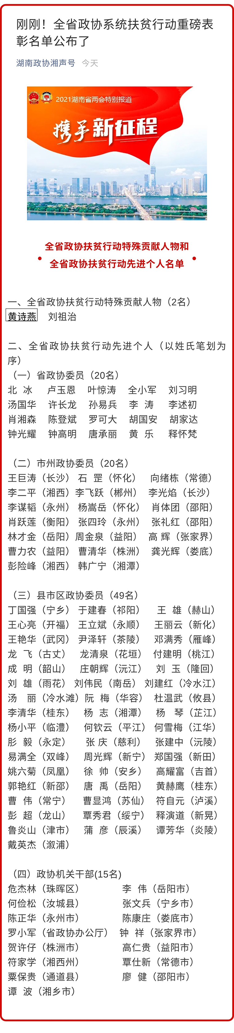 開幕會上,湖南省政協(xié)副主席賴明勇宣讀了全省政協(xié)扶貧行動先進個人表彰決定。據(jù)了解,自2016年以來,全省各級政協(xié)組織和廣大政協(xié)委員積極參與省政協(xié)“助力脫貧攻堅、全面建成小康社會”主題活動,參與“三個一”扶貧行動和“湖南政協(xié)人助力鞏固脫貧成果萬戶幫扶”行動,涌現(xiàn)出一大批深入群眾、無私奉獻、成效突出的扶貧先進典型,為我省決戰(zhàn)決勝脫貧攻堅、全面建成小康社會貢獻了政協(xié)智慧和力量。為表彰先進、樹立典型、展示成效、激發(fā)動力,經(jīng)全省各級政協(xié)組織推薦,全省政協(xié)扶貧行動先進個人評審領(lǐng)導小組評議,省政協(xié)主席會議審議通過,決定授予胡國安委員等20位省政協(xié)委員以及84位市縣政協(xié)委員、機關(guān)干部“全省政協(xié)扶貧行動先進個人”稱號。