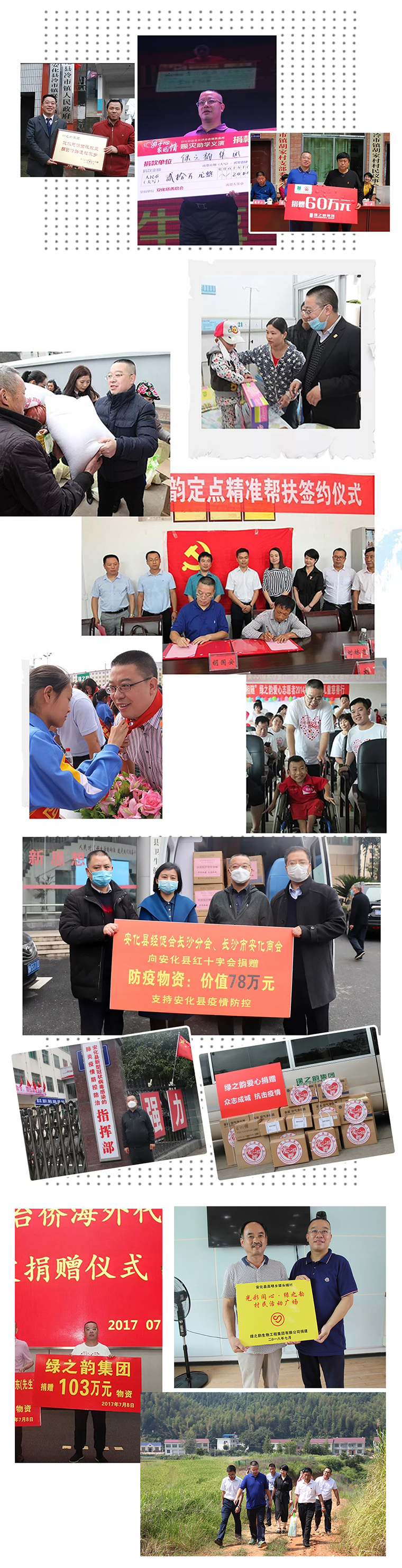 早在2006年,綠之韻便設(shè)立了“綠之韻慈善基金”,2015年獲省民政廳批準(zhǔn)升級為湖南省“綠之韻公益基金會”。并積極與中華慈善總會、湖南省慈善總會、湖南省長沙市光彩事業(yè)基金會、長沙市青少年發(fā)展基金會、國際關(guān)心中國慈善協(xié)會(ICC)等機構(gòu)緊密合作,大力推進公益扶貧項目,建立常規(guī)化公益援助機制。截止目前,綠之韻集團已經(jīng)累計捐建了11所希望學(xué)校,踴躍參與和捐助了100多項品牌公益慈善項目,項目涉及賑災(zāi)濟困、興教助學(xué)、孤殘救助、醫(yī)療衛(wèi)生、修路飲水、養(yǎng)老醫(yī)療等多個領(lǐng)域,累計捐款捐物7000多萬元。除了大力參與賑災(zāi)、抗疫、扶貧、幫困等社會慈善事業(yè)之外,還積極開展關(guān)愛貧困母親、綠韻圓夢書香助學(xué)、關(guān)愛孤殘兒童、“綠跑”大型公益計劃等具有綠之韻品牌和社會影響力的公益活動。
