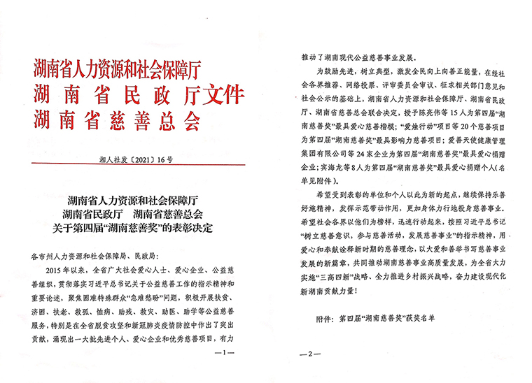 2021年5月19日,第四屆“湖南慈善獎”表彰大會在湖南賓館舉行。湖南省人民政府副省長朱忠明,省人民政府副秘書長彭翔,省人大社會建設(shè)委員會副主任委員卞鷹,省民政廳廳長曹忠平,湖南日報黨組書記、社長姜協(xié)軍,省人力資源社會保障廳黨組成員、副廳長焦華芳,省民政廳一級巡視員楊薇,省工商業(yè)聯(lián)合會二級巡視員劉建平等領(lǐng)導(dǎo)出席會議。湖南省慈善總會副會長、綠之韻集團董事長胡國安受邀參加會議。