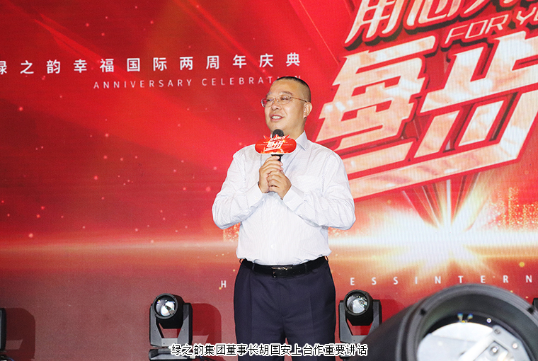 會(huì)議最后,在現(xiàn)場最為熱烈的掌聲中,綠之韻集團(tuán)董事長胡國安上臺(tái)講話。他首先向大會(huì)現(xiàn)場以及通過在線互動(dòng)視頻觀看本次周年慶典的綠之韻家人致以熱烈的歡迎和誠摯的問候,并向每一位獲獎(jiǎng)?wù)弑硎緹崃业淖YR。他說道,我是綠之韻代言人胡國安,也是你們的幸福代言人。今年的7月1日,我們即將迎來偉大的中國共產(chǎn)黨100周年誕辰。百年來,因?yàn)檠影簿?、井岡山精神、抗疫精神、抗震精神等一系列?yōu)秀的傳承精神為中國共產(chǎn)黨的繁榮、發(fā)展和壯大注入了源源不斷的新動(dòng)能。在綠之韻幸福國際兩周年之際,我十分欣慰,看到如此多優(yōu)秀的幸福代言人獲得了屬于自己的榮譽(yù),看到臺(tái)前幕后許許多多幸福國際領(lǐng)導(dǎo)人忙碌的身影,從你們身上看到了那種優(yōu)秀的精神,我為你們點(diǎn)贊!未來,在綠之韻事業(yè)的發(fā)展路上,在幸福國際的路上,在奔向幸福的道路上,有你,有我,有我們。我相信,各位幸福代言人將在綠之韻集團(tuán)執(zhí)行總經(jīng)理夏運(yùn)良的領(lǐng)導(dǎo)下取得更大的突破。我更欣慰的看到你們在市場發(fā)展的過程中,始終堅(jiān)持“以產(chǎn)品為導(dǎo)向”發(fā)展理念,致力于傳承中華五千年養(yǎng)生文化,堅(jiān)持走中國的大健康之路,堅(jiān)持把支部扎根在連隊(duì)上,培養(yǎng)各類優(yōu)秀骨干。真心的祝愿現(xiàn)場的每一位幸福代言人,希望你們在未來綠之韻幸福國際的3周年、5周年乃至10周年的頒獎(jiǎng)盛典上,都能成為家族的驕傲、同事學(xué)習(xí)的榜樣,公司的骨干,國家的棟梁。讓我們一起奔跑在幸福的道路上。