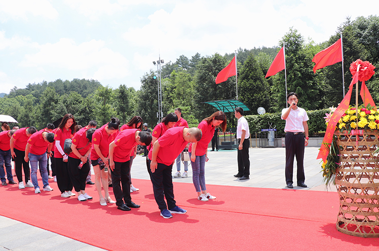 在現(xiàn)場(chǎng)工作人員的帶領(lǐng)下,一行人來到毛澤東銅像廣場(chǎng),瞻仰偉大的毛主席。毛主席銅像立于高高的紅色花崗巖石基座上,背靠韶峰,主席身軀偉岸,手握書卷,雙眼炯炯有神,面帶微笑地注視遠(yuǎn)方。大家表情莊嚴(yán)肅穆,整齊有序地排著隊(duì)列,懷著無比崇敬的心情,向毛主席銅像敬獻(xiàn)花籃,每個(gè)人都自發(fā)自覺地用自己的方式懷念著這位偉大的領(lǐng)袖。