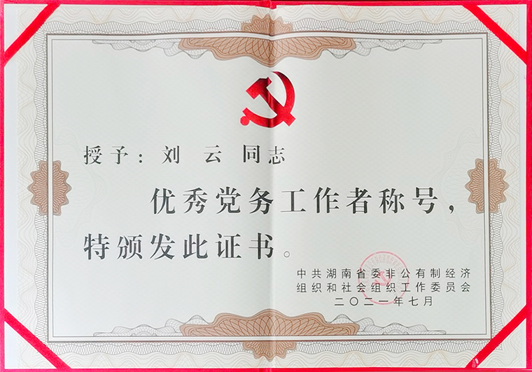 2021年7月6日,湖南省委非公有制經(jīng)濟(jì)組織和社會組織優(yōu)秀共產(chǎn)黨員、優(yōu)秀黨務(wù)工作者和先進(jìn)基層黨組織表彰大會在長沙召開。中共湖南省委常委、省委組織部部長王成,中共湖南省委組織部副部長陳瀟,中共湖南省委統(tǒng)戰(zhàn)部副部長劉事青,省民政廳黨組書記、廳長、省委兩新工委副書記曹忠平,省市場監(jiān)管局黨組書記、局長、省委兩新工委副書記、省非公有制經(jīng)濟(jì)組織綜合黨委書記向曙光,中共湖南省委兩新工委專職副書記羅纘吉等領(lǐng)導(dǎo)出席會議。綠之韻集團(tuán)黨委書記劉云參加會議,并被授予湖南省“優(yōu)秀黨務(wù)工作者”榮譽(yù)。