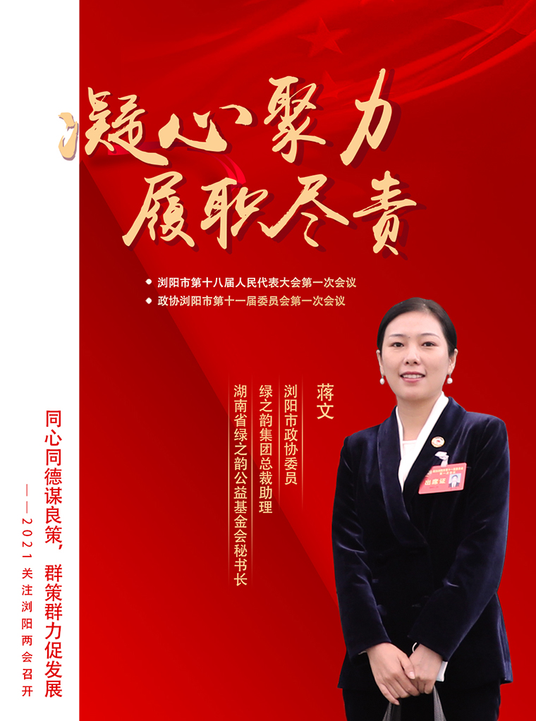 作為履新的政協(xié)委員,蔣文委員深感責任在肩、使命在前。政協(xié)委員的頭銜于她而言既是一項政治榮譽,更多的是一份政治責任。2006年7月,綠之韻集團創(chuàng)始人胡國安董事長發(fā)起設立“綠之韻慈善基金”,2015年升級為湖南省“綠之韻公益基金會”。截止目前,已踴躍參與和傾情捐助了100多項社會公益慈善事業(yè),開展了400多場愛心慈善活動,累計捐款捐物達7000余萬元。作為綠之韻公益基金會秘書長,她表示,未來五年,是瀏陽實施“三高四新”戰(zhàn)略、踐行“四個爭當”的深化期,是全面推進高質(zhì)量發(fā)展、建設現(xiàn)代化新瀏陽的關(guān)鍵期,更是綠之韻從“四五規(guī)劃”向“五五規(guī)劃”穩(wěn)步邁進的關(guān)鍵時期。站在新的歷史起點上,她將以理論學習與社會實踐結(jié)合為抓手,提升自己履職能力的同時,逐步了解“政協(xié)是什么、干什么和怎么干”,積極履行政治協(xié)商、民主監(jiān)督、參政議政職能;從實際工作出發(fā),最大限度地關(guān)注公益慈善,助力企業(yè)積極履行社會責任,為民生和社會熱點發(fā)聲,做到撰寫的每份提案都有溫度。同時,和其他委員們一起緊緊圍繞瀏陽市委市政府加快建成“兩個中心”、“挺進全國五強”的發(fā)展目標,建睿智之言,獻務實之策,為全面建設現(xiàn)代化新瀏陽而努力奮斗。