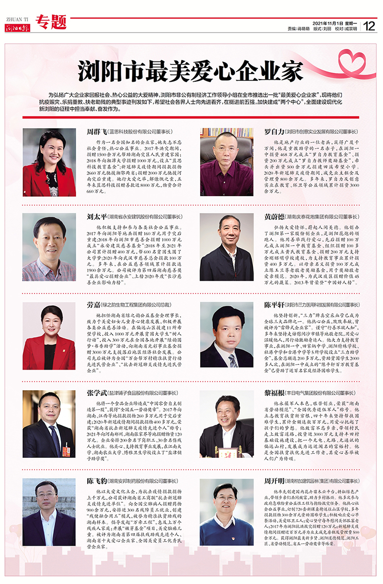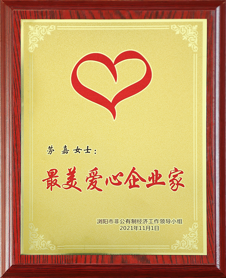 為弘揚廣大企業(yè)家回報社會、熱心公益的大愛精神,瀏陽市非公有制經(jīng)濟(jì)工作領(lǐng)導(dǎo)小組在全市推選出一批“最美愛心企業(yè)家”。綠之韻集團(tuán)董事、總裁,湖南省綠之韻公益基金會理事長勞嘉憑借著多年來在公益慈善領(lǐng)域的突出貢獻(xiàn)被授予瀏陽市“最美愛心企業(yè)家”稱號。