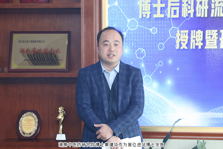 黃建華作為首位進(jìn)站博士在會(huì)上發(fā)言。他表示,將繼續(xù)做好專業(yè)工作的排頭兵,勇于創(chuàng)新,勤于實(shí)踐。一是堅(jiān)持好基礎(chǔ)研究;二是與企業(yè)需求相結(jié)合,與公司的科研人員一道攻堅(jiān)克難,完善知識(shí)儲(chǔ)備、促進(jìn)交流合作和成果轉(zhuǎn)化;三是做好銜接工作,作為學(xué)校和企業(yè)之間的橋梁,共同建設(shè)好科研協(xié)作中心平臺(tái),力爭取得更好的科研成果。湖南中醫(yī)藥大學(xué)研究生院院長喻嶸表示,非常感謝綠之韻集團(tuán)一直支持科學(xué)研究工作,希望雙方借此契機(jī)更好的實(shí)現(xiàn)科研資源共享、校企合作以及高端人才培養(yǎng),使博士后管理工作高效、高質(zhì)量、可持續(xù)發(fā)展。