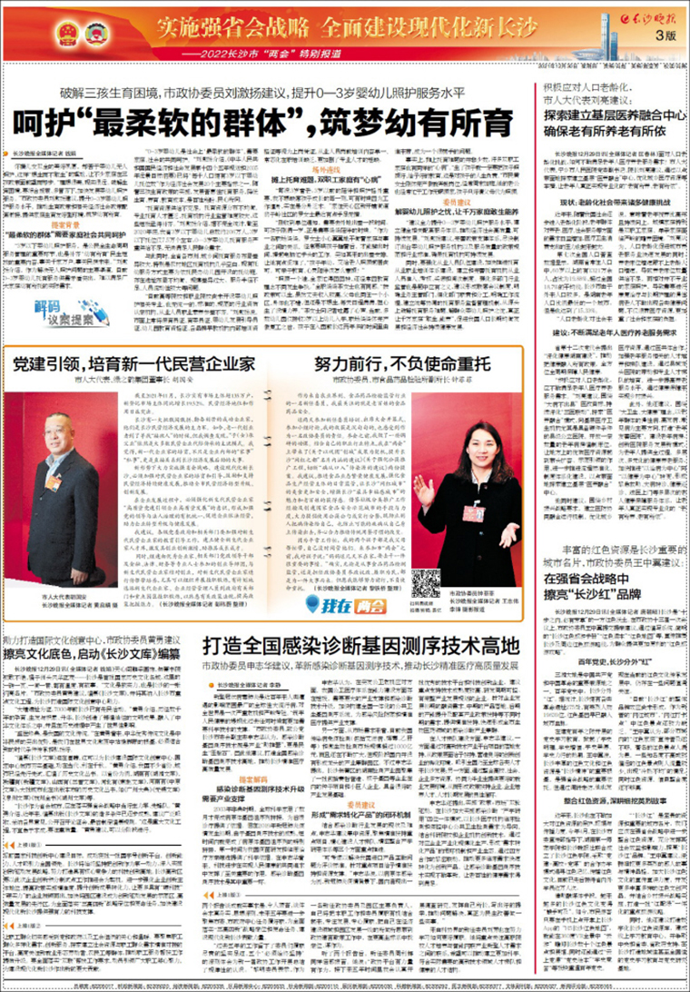 會議期間,胡國安代表廣泛同各界別代表們分別圍繞市委、市政府的中心工作,聚焦長沙強(qiáng)省會發(fā)展大局和人民群眾普遍關(guān)心的重點問題,進(jìn)行深入探討和交流。此次會議,他提交了《關(guān)于新形勢下加強(qiáng)新生代民營企業(yè)家培育和引導(dǎo)的議案》和《關(guān)于促進(jìn)大健康產(chǎn)業(yè)發(fā)展助力“強(qiáng)省會”戰(zhàn)略的建議》兩件議案。《關(guān)于新形勢下加強(qiáng)新生代民營企業(yè)家培育和引導(dǎo)的議案》,建議加強(qiáng)黨建引領(lǐng),強(qiáng)化新生代民營企業(yè)家“高質(zhì)量黨建引領(lǐng)企業(yè)高質(zhì)量發(fā)展”的意識,并通過建立健全新生代企業(yè)家人才庫,組建由優(yōu)秀企業(yè)家、相關(guān)部門黨政領(lǐng)導(dǎo)干部及金融、法律、財務(wù)等專業(yè)人士參加的創(chuàng)業(yè)導(dǎo)師團(tuán),組織開展掛職鍛煉,樹立先進(jìn)典型等方式方法為新生代民營企業(yè)家施展才華創(chuàng)造有利的條件,加大對新生代企業(yè)家創(chuàng)業(yè)發(fā)展的扶持和服務(wù)力度。《關(guān)于促進(jìn)大健康產(chǎn)業(yè)發(fā)展助力強(qiáng)省會戰(zhàn)略的建議》,建議通過打造自主優(yōu)勢品牌,助推企業(yè)由速度型向質(zhì)量型轉(zhuǎn)變;完善相關(guān)政策法律法規(guī),加強(qiáng)健康產(chǎn)業(yè)誠信建設(shè);建立健全支持健康產(chǎn)業(yè)發(fā)展的政策,支持企業(yè)做大做精做強(qiáng)等措施,構(gòu)建大健康產(chǎn)業(yè)核心區(qū),打造大健康產(chǎn)業(yè)新高地,將為我市推進(jìn)強(qiáng)省會戰(zhàn)略提供重要的支撐。胡國安代表今年的兩件議案,內(nèi)容緊扣當(dāng)前焦點熱點話題,受到與會代表的廣泛認(rèn)同,引發(fā)多家新聞媒體聚焦報道。