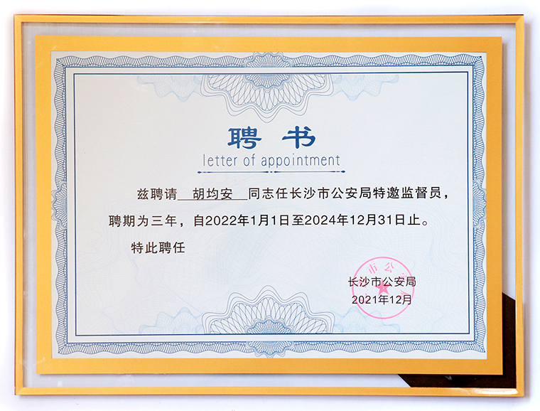 2022年1月12日上午,長沙市公安局特邀監(jiān)督員換屆會議在長沙召開。長沙市公安局機(jī)關(guān)黨委(紀(jì)委)主要負(fù)責(zé)人、22名長沙市公安局新一屆特邀監(jiān)督員參加會議。長沙市公安局黨委委員、政治部主任唐明為市局特邀監(jiān)督員頒發(fā)聘書并作講話;長沙市公安局機(jī)關(guān)紀(jì)委副書記謝勝宣讀《關(guān)于長沙市公安局特邀監(jiān)督員的聘任決定》。綠之韻集團(tuán)副總裁胡均安作為優(yōu)秀企業(yè)家代表,憑借多年對社會民生的關(guān)注、擔(dān)任社會職務(wù)積極履職的表現(xiàn),再次受聘為長沙市公安局特邀監(jiān)督員。
