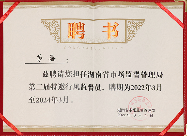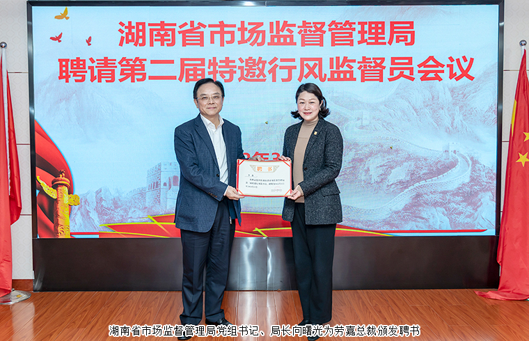 湖南省市場監(jiān)督管理局黨組成員、省藥監(jiān)局黨組書記梁毅恒宣讀了《關(guān)于省局干部隊伍作風(fēng)紀律教育整頓總體情況的通報》。湖南省市場監(jiān)督管理局副局長李沐宣讀聘請?zhí)匮酗L(fēng)監(jiān)督員的通知。勞嘉總裁受聘為湖南省市場監(jiān)督管理局第二屆特邀行風(fēng)監(jiān)督員。