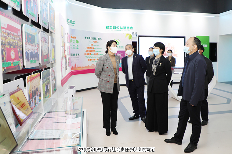 在綠之韻國際會議中心展廳,勞嘉總裁就企業(yè)基本情況、生產(chǎn)經(jīng)營、市場布局、依法納稅、非公黨建和公益慈善等方面的工作情況向調(diào)研組一行做了詳細匯報。多年來,綠之韻不斷加大科研投入,不斷深化“產(chǎn)學(xué)研”合作,先后與多所科研機構(gòu)、高等院校達成戰(zhàn)略合作,成立了產(chǎn)品專家委員會,不斷提升產(chǎn)品核心競爭力。在企業(yè)發(fā)展的同時,公司積極承擔社會責(zé)任,踴躍參與和傾情捐助了100多項公益事業(yè),累計捐贈款物7000多萬元。