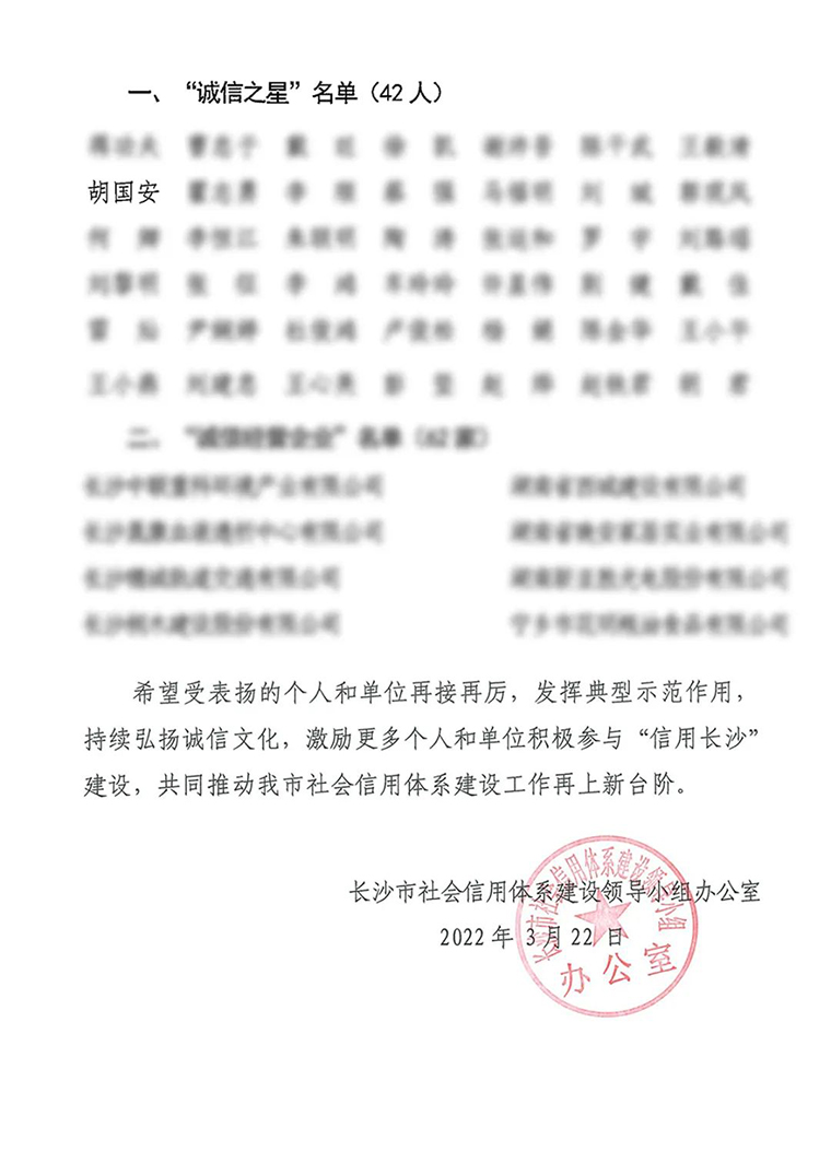 據(jù)了解,“誠信之星”“誠信經(jīng)營企業(yè)”評選活動是全面推進長沙市社會信用體系建設,大力弘揚社會主義核心價值觀,進一步加強社會誠信建設的有力措施。此次,評選活動通過宣傳發(fā)動、各單位推薦、組織評審、社會監(jiān)督多個環(huán)節(jié),經(jīng)長沙市社會信用體系建設領導小組綜合評定最終決出信用示范單位7家,誠信經(jīng)營企業(yè)62家,誠信行業(yè)協(xié)會、商會11家,優(yōu)秀信用服務機構2家以及誠信之星42名。