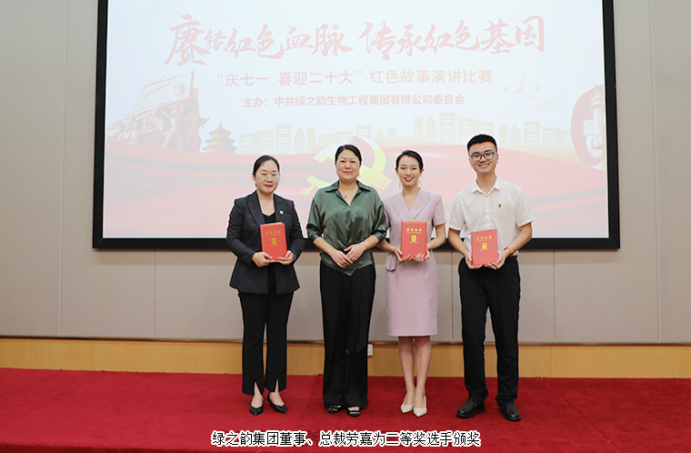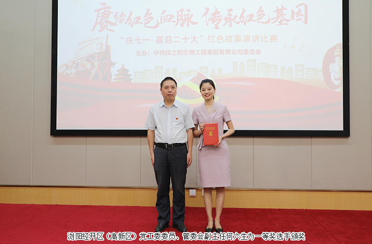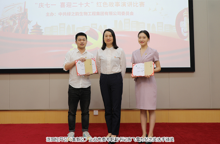比賽結(jié)束,綠之韻集團黨委組織委員楊丹宣讀比賽結(jié)果。隨后,與會領(lǐng)導(dǎo)為獲獎選手頒獎。瀏陽經(jīng)開區(qū)(高新區(qū))黨工委委員、管委會副主任何六生在講話中表示,每一個紅色故事,都是一場生動的黨課,聆聽了所有選手的深情演講,收獲許多也學(xué)習(xí)到許多。他向今天獲得表彰的選手表示祝賀,向在場的所有黨員送上“七一”生日祝福,并祝愿綠之韻的明天更加美好。綠之韻集團黨委書記劉云表示,感謝公司領(lǐng)導(dǎo)對此次活動的支持重視與熱情參與,大家的肯定與支持是推進集團黨建工作的力量源泉。她對今天參加比賽的所有選手給予了肯定和鼓勵。她希望,在集團公司黨委的帶領(lǐng)下,所有黨員能把弘揚革命傳統(tǒng),傳承紅色基因融入到企業(yè)發(fā)展的全過程,匯聚綠之韻最大“同心圓”,不忘初心、奮力譜寫新時代高質(zhì)量發(fā)展的新篇章,開創(chuàng)綠之韻更加美好的未來。